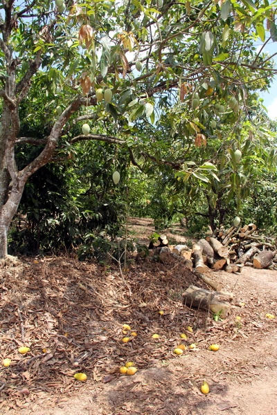 Dọc các con đường của xã La Ngà, xoài chín rục, rụng đầy vườn. "Xoài cuối vụ số lượng chẳng còn bao nhiêu nhưng công thuê người hái cao (200.000 đồng một ngày) nên nhiều bà con để xoài chín rụng chứ hái bán cũng không lời bao nhiêu", ông Cư lý giải.