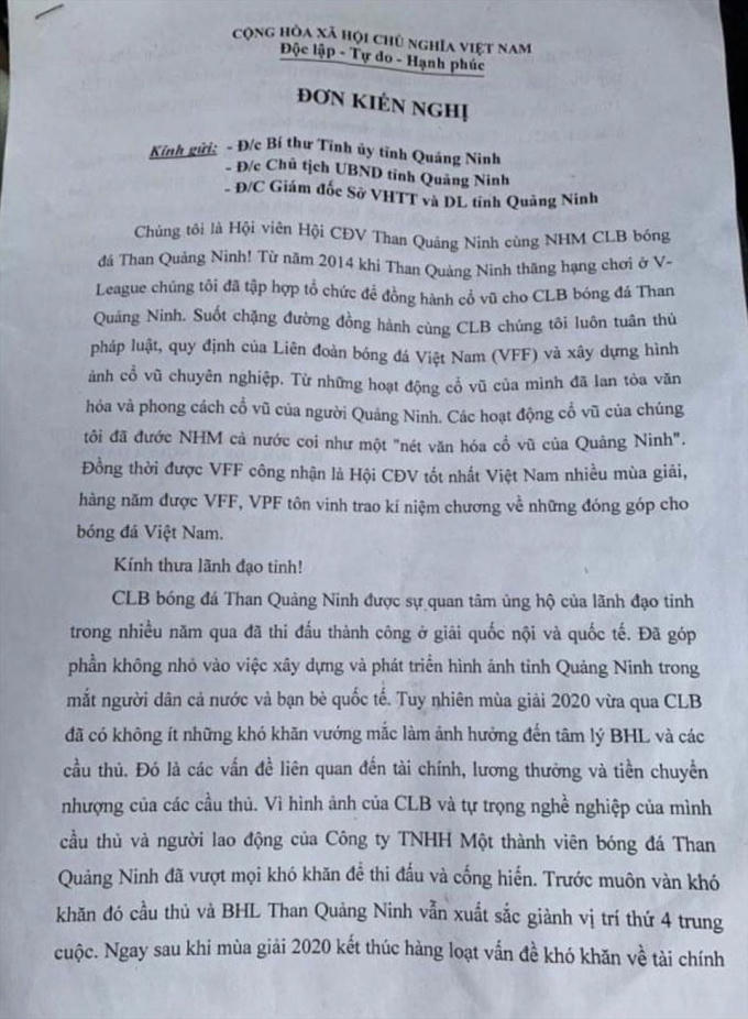 Đơn kiến nghị của Hội CĐV Than Quảng Ninh. Ảnh: HCDV