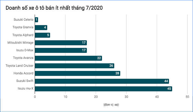 | Xếp hạng | Mẫu xe | Doanh số tháng 7/2020 | Doanh số tháng 6/2020 | So sánh doanh sốtháng 6 và 7 |