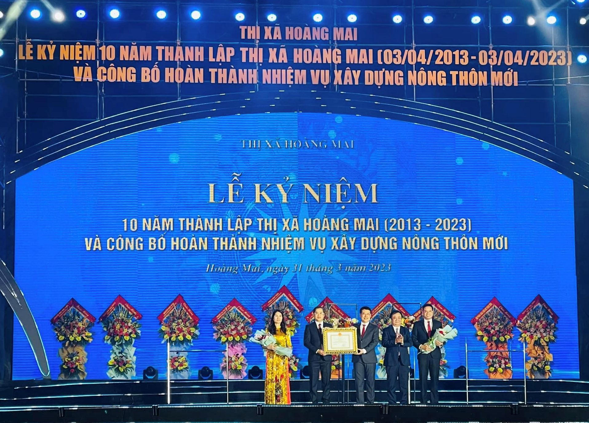 Tối 31/3, thị xã Hoàng Mai (Nghệ An) long trọng tổ chức Lễ kỷ niệm 10 năm thành lập, đón Bằng công nhận hoàn thành nhiệm vụ xây dựng nông thôn mới.