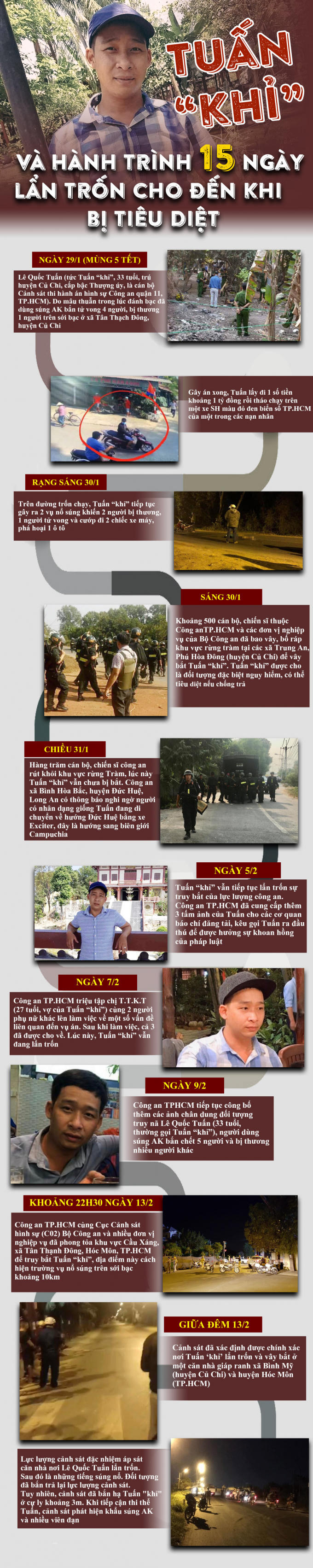 Trước khi bị tiêu diệt trong cuộc đấu súng với lực lượng cảnh sát đặc nhiệm, Tuấn “khỉ” đã lẩn trốn suốt 15 ngày trong sự truy bắt ráo riết của công an.