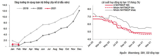 "Chúng tôi cho rằng lãi suất tiền gửi và cho vay sẽ vẫn giữ ở mức thấp hiện tại trong quý 1 và đầu quý 2/2021, có thể nhích tăng từ cuối quý 2 khi các hoạt động kinh tế sôi động hơn giúp tăng cầu tín dụng" - SSI Research cho hay.