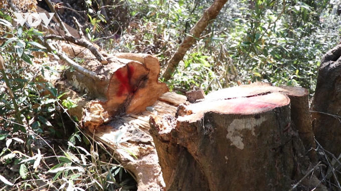 Đoàn kiểm tra liên ngành bước đầu xác định có hơn 170 cây gỗ bị khai thác trong rừng đặc dụng Mường Phăng. Ảnh: VOV