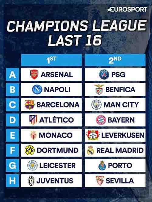 16 đội bóng vào đến giai đoạn này gồm có Arsenal, PSG (nhất và nhì bảng A), Napoli, Benfica (bảng B), Barca, Man City (bảng C), Atletico Madrid, Bayern (bảng D), Monaco, Leverkusen (bảng E), Dortmund, Real Madrid (bảng F), Leicester, Porto (bảng G), và Juventus, Sevilla (bảng H).