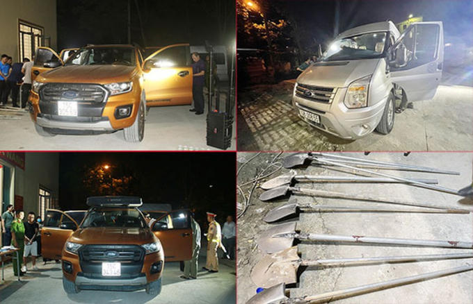 Phương tiện thu giữ tại hiện trường 3 xe ô tô và số hung khí giấu trên xe. Ảnh: Tống Huệ - Thanh Tuấn
