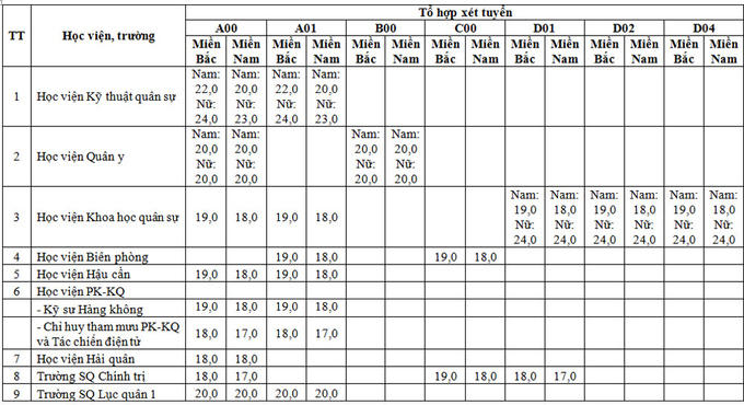 Dưới đây là bảng mức điểm nhận hồ sơ xét tuyển vào 19 trường Đại học khối Quân đội: