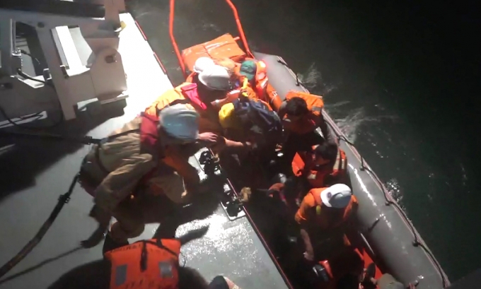 Lực lượng chức năng di chuyển thuyển viên trên tàu gặp nạn xuống xuồng cứu hộ đêm 20/2 (Ảnh Trung tâm II):