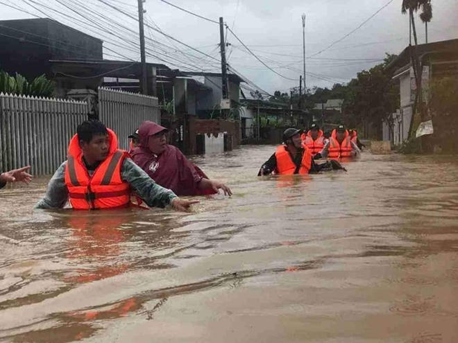Công an, bộ đội dầm mình trong nước lũ đục ngầu giúp dân