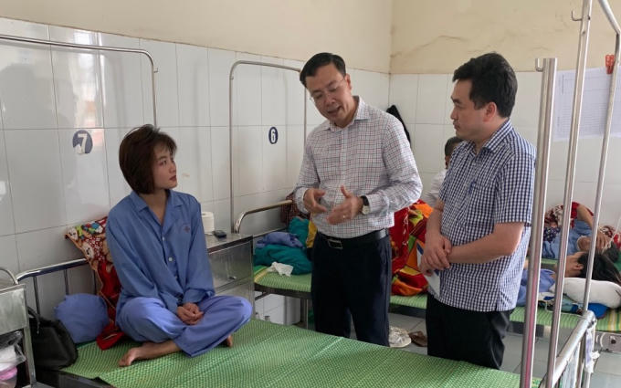 Ông Vũ Hữu Tuyến - Chủ tịch công đoàn (áo trắng) và Giám đốc xí nghiệp buýt Cầu Bươu đang thăm hỏi động viên.