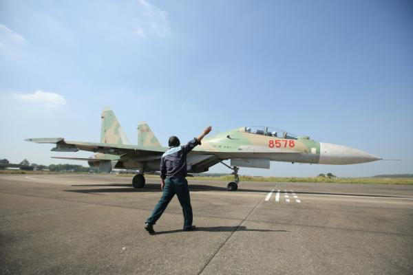 Máy bay chiến đấu SU-30MK2 của Trung đoàn không quân 935 (Sư đoàn 370) được kiểm tra và chuẩn bị cất cánh huấn luyện.
