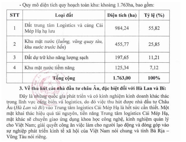 Dự án trung tâm logistics Cái Mép Hạ có diện tích khoảng 1.763ha, tổng mức đầu tư dự kiến khoảng 19.200 tỷ đồng, trong đó chưa bao gồm chi phí giải phóng mặt bằng.