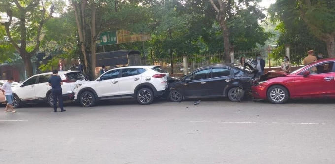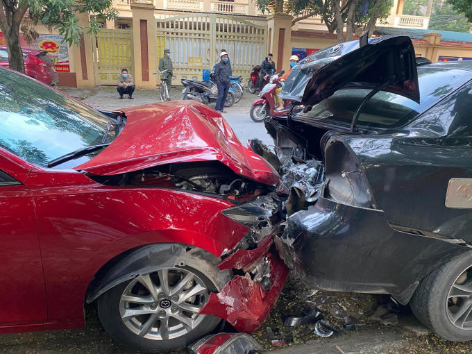 Khi đến khu vực sân bóng phường Trường Thi, chiếc xe mazda màu đỏ bất ngờ tông vào đuôi chiếc xe ô tô hiệu gentra màu đen đậu phía trước. Cú va chạm cực mạnh đẩy chiếc xe Gentra này tiếp tục lao lên và gây ra vụ tai nạn liên hoàn cho 3 xe ô tô phía trước. Hậu quả, cả 5 xe ô tô dính chặt vào nhau, trong đó 3 xe ở giữa hư hỏng nặng cả đầu và đuôi xe.
