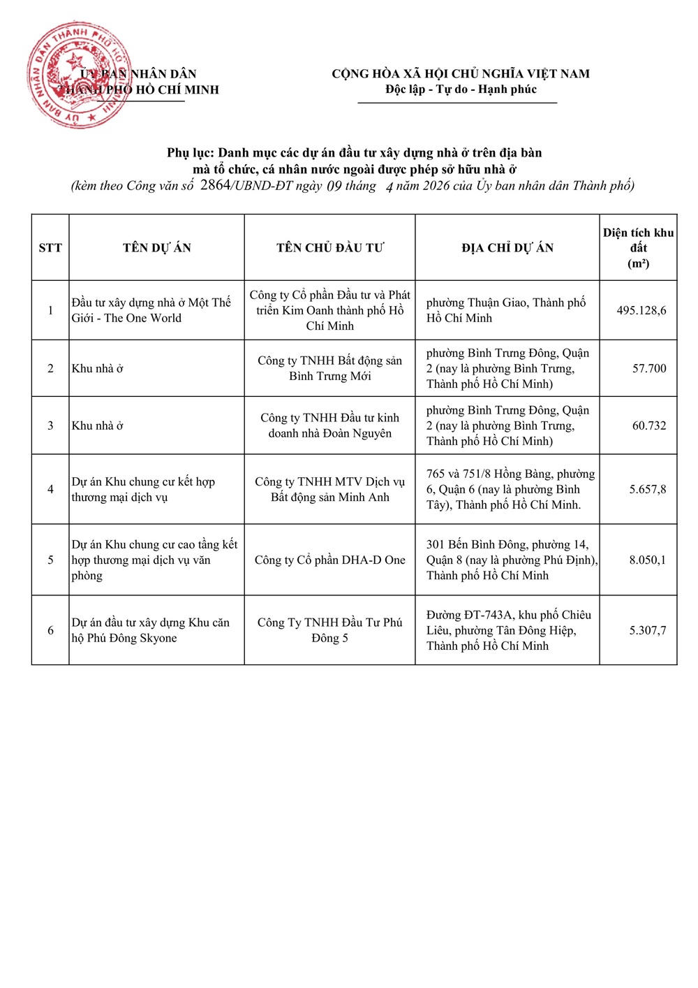 UBND TP HCM ban hành văn bản công bố danh mục 06 dự án đầu tư xây dựng nhà ở trên địa bàn mà tổ chức, cá nhân nước ngoài được phép sở hữu nhà ở theo quy định tại khoản 3 Điều 4 của Nghị định số 95/2024/NĐ-CP ngày 24/7/2024 của Chính phủ.