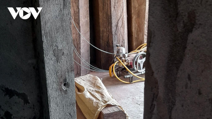 Phía "sân sau" của quán này còn có đội ngũ lao động thực hiện việc chế biến thớt gỗ nghiến. Những khúc gỗ nghiến lớn chưa chế biến, được phát hiện giấu trong nhà vệ sinh.