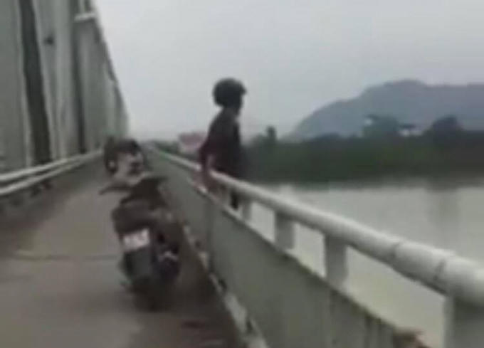 Khi đi gần giữa cầu, anh T để xe lại rồi leo nhanh ra đứng phía ngoài lan can.