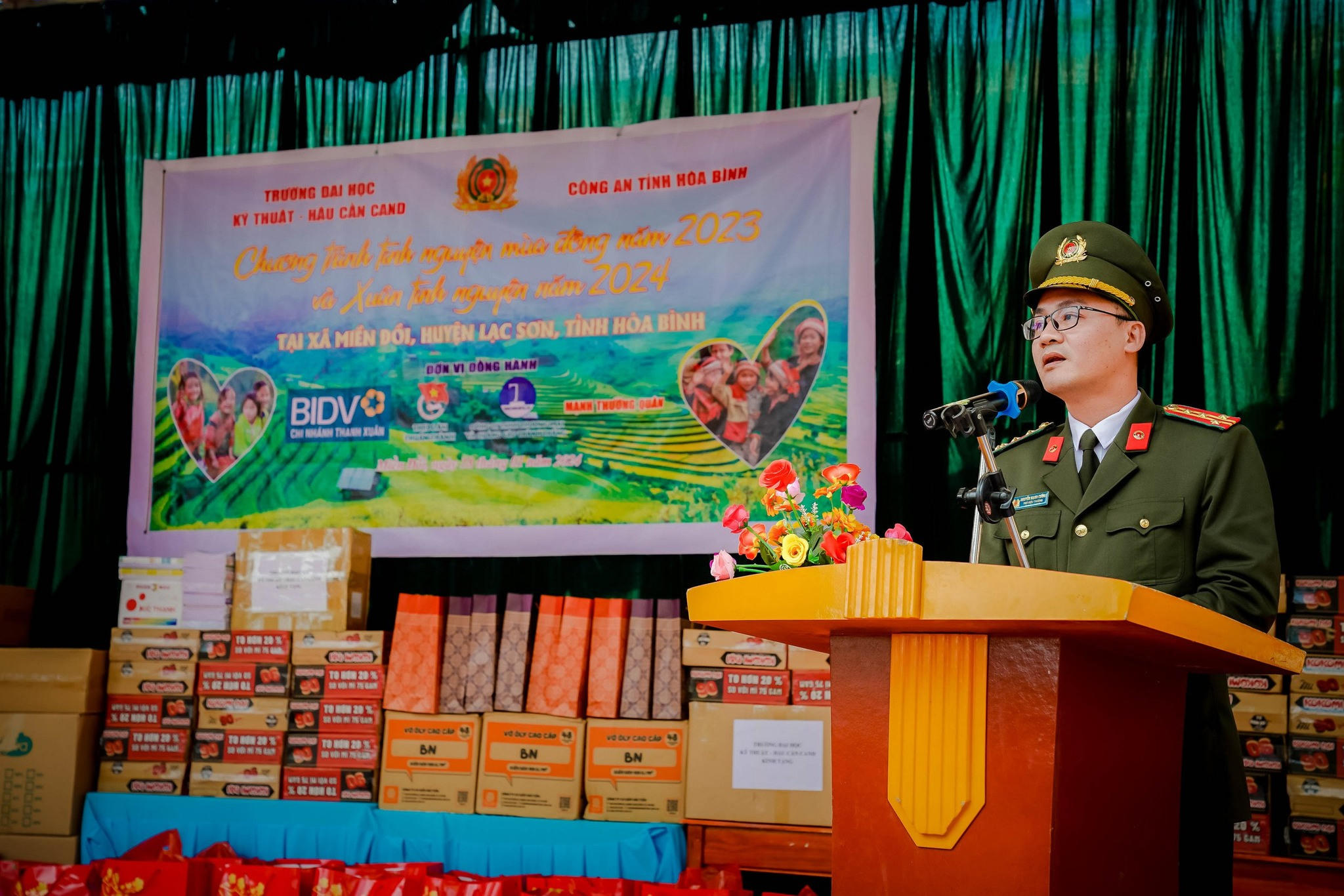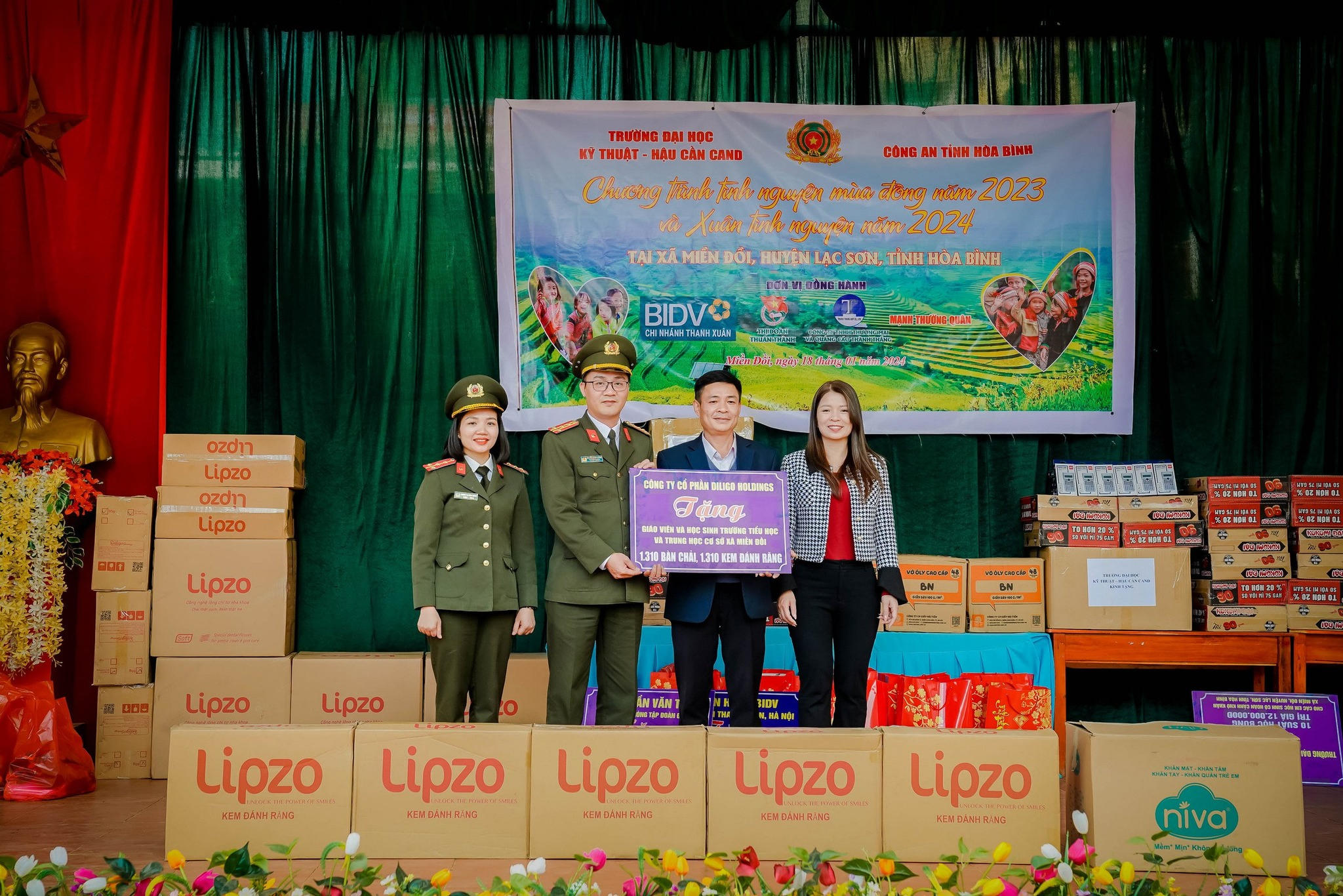 Mới đây, trường Đại học Kỹ thuật - Hậu cần CAND phối hợp với Công an tỉnh Hòa Bình tổ chức chương trình “Tình nguyện mùa đông năm 2023” và “Xuân tình nguyện năm 2024” tại xã Miền Đồi, huyện Lạc Sơn, tỉnh Hòa Bình. Chương trình có sự đồnh hành của Ngân hàng BIDV chi nhánh Thanh Xuân, Thị Đoàn Thuận Thành - Bắc Ninh, Công ty cổ phần Diligo Holdings, Công ty TNHH Thương mại và Quảng cáo Thành Thắng cùng các mạnh thường quân.