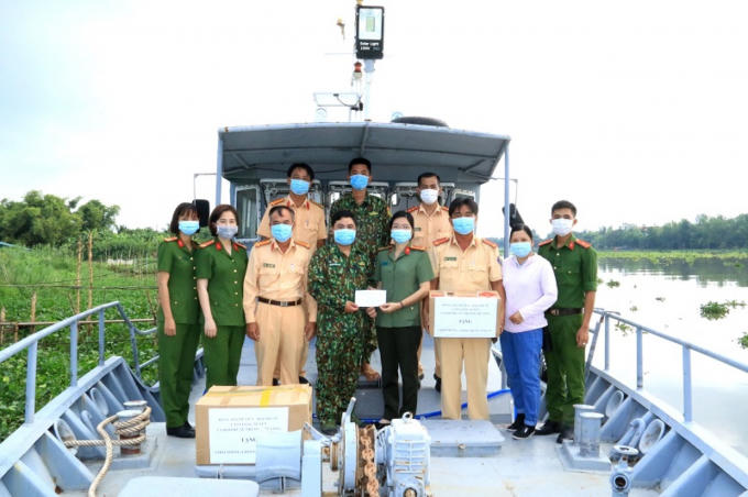 Thượng tá Lê Văn Thích, Phó Trưởng Công an thành phố Long Xuyên trao quà cho các chiến sĩ tại các chốt chống dịch.