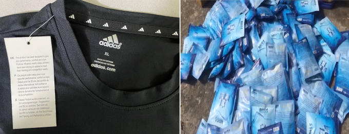 Tiến hành kiểm tra, lực lượng chức năng phát hiện trên xe vận chuyển 2 nghìn cái áo thun nghi vấn giả mạo nhãn hiệu Adidas; 4.5 nghìn gói bột tắm trắng bôi da không rõ nguồn gốc, xuất xứ; 1.2 nghìn hũ kem tẩy tế bào chết do Thái Lan sản xuất và 500 cái quần thun ngắn do Cambodia sản xuất. Tổng giá trị giá hàng hóa trên 180 triệu đồng.