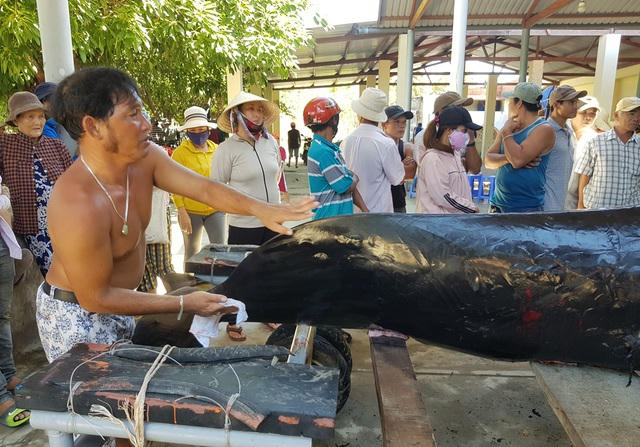 Sau đó xác định cá voi chết dạt vào bờ, một số người dân đã báo cho trưởng thôn, chính quyền địa phương để đưa cá voi lên. Người dân đã huy động xe ba gác xuống bãi biển, khiêng cá voi lên xe chở lên Lăng Ông gần đó để tiến hành thủ tục mai táng theo phong tục địa phương.