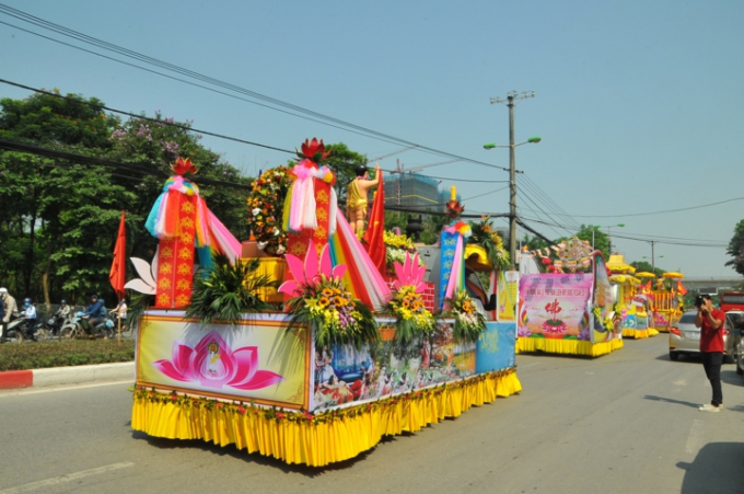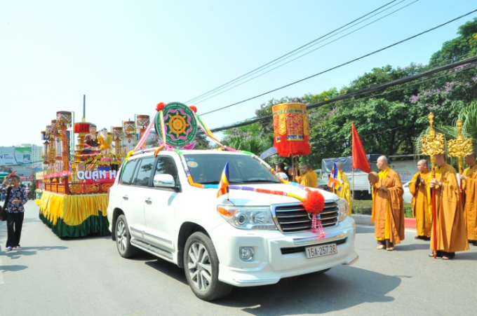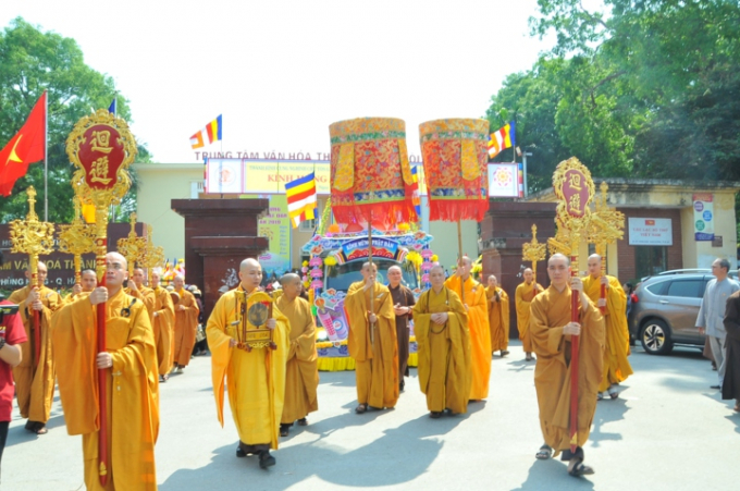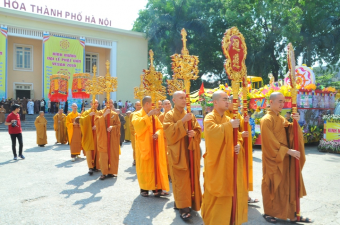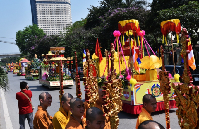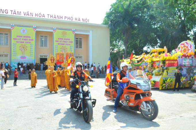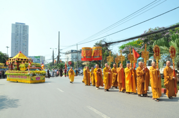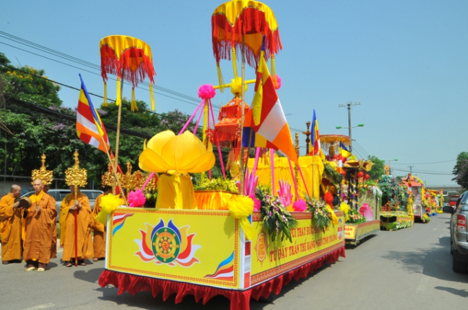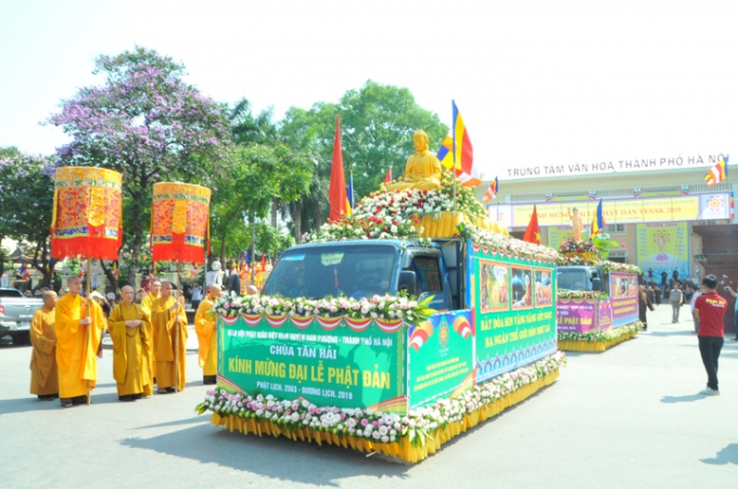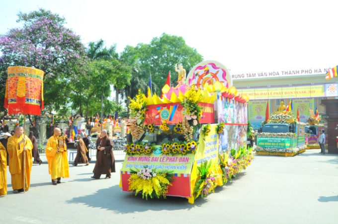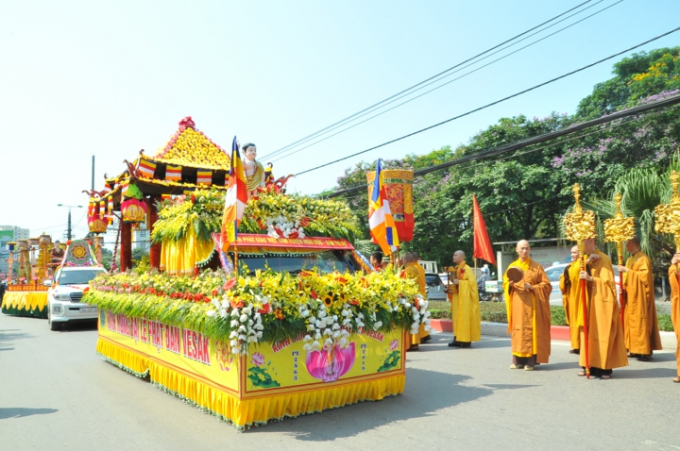 Sáng cùng ngày, hàng trăm tăng ni, phật tử đã tham gia diễu hành xe hoa, và thực hiện các nghi thức Phật giáo.