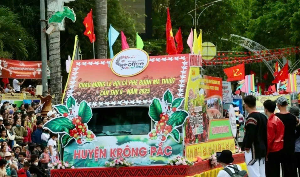 Một điểm nhấn không thể bỏ lỡ là đoàn diễu hành xe hoa được trang trí công phu, tái hiện hành trình hạt cà phê từ nương rẫy đến ly cà phê thơm ngon vươn ra thế giới.