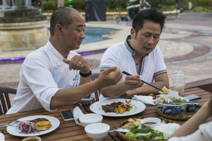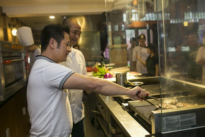 Ca sĩ Bằng Kiều thích thú khi tự tay thực hiện món bít-tết, món ăn “tủ” của mình dưới sự hướng dẫn của Vua đầu bếp Phạm Tuấn Hải