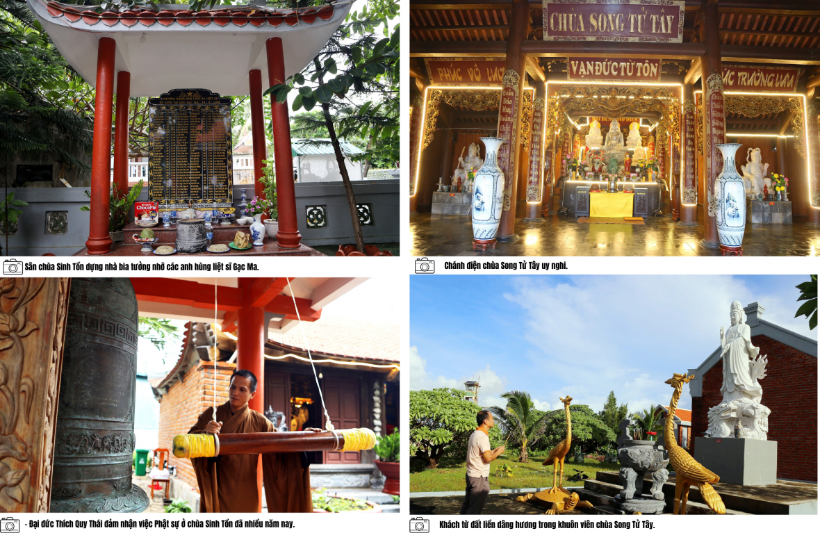 Cổng tam quan chùa Sinh Tồn Đông hiên ngang với cặp câu đối mà tôi chưa từng gặp nơi nào khác. Ý tứ hào sảng tinh thần chủ quyền Việt: “Đức sánh càn khôn sáng tỏ trời Nam riêng một cõi/ Uy trùm vũ trụ rạng ngời đất Việt khắp muôn dân”, và “Biển đảo cùng nhau thề dốc lòng giữ vẹn nền đất Tổ/ Giang sơn như có hẹn nắm tay quyết trọn tấm lòng son”.