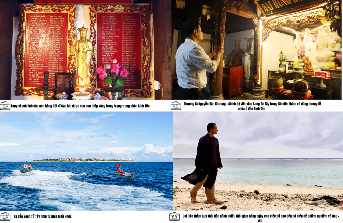 Bước lên những Sinh Tồn Đông, Song Tử Tây, Nam Yết, Sơn Ca, Sinh Tồn, Đá Tây A, Phan Vinh, Trường Sa Đông, Trường Sa hôm nay, là thấp thoáng những ngôi chùa Việt với màu ngói đỏ nổi lên giữa đại dương xanh ngắt.