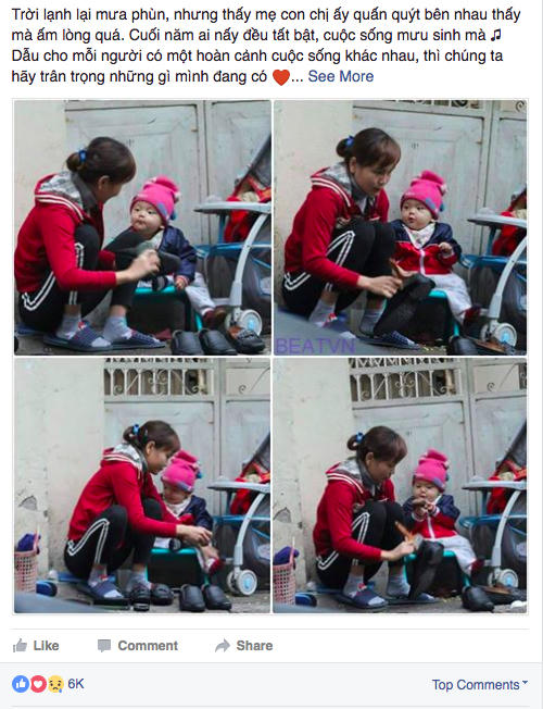 Chùm ảnh hai mẹ con đánh giày trên phố trong những ngày giáp Tết đang được nhiều cư dân mạng chia sẻ. Trên một diễn đàn giới trẻ, những bức ảnh này đã hút hơn 6.000 lượt Thích và hàng ngàn lượt Chia sẻ.