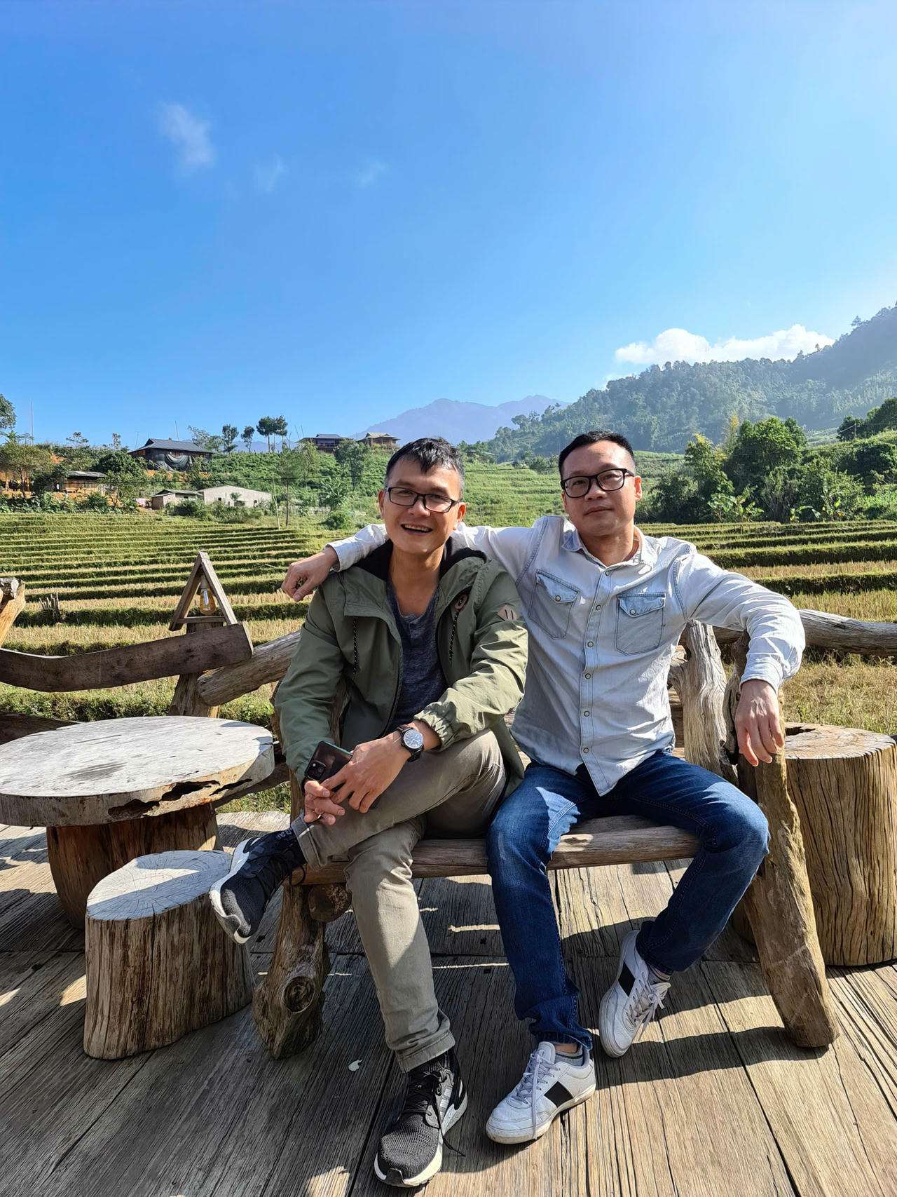 | Cố nhà báo Hà Sơn Bình và tác giả trong một chuyến công tác ở Trạm Tấu. |