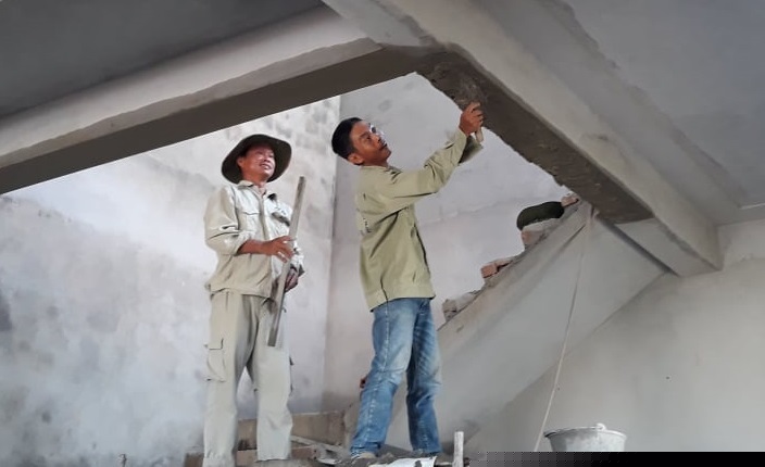 Công việc thợ hồ hàng ngày của anh Hòa (người không đội mũ).