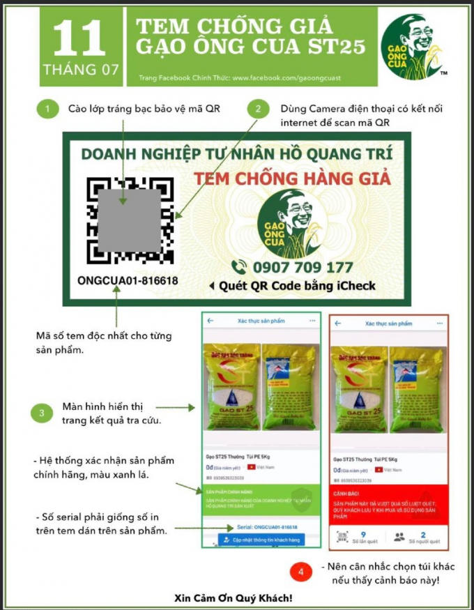 Để đảm bảo cho quý khách hàng được cung cấp sản phẩm Gạo Ông Cua chính hãng, tránh việc mua nhầm gạo nhái, gạo kém chất lượng, ông Trần Văn Kiệm – Chủ tịch Hội đồng quản trị Công ty Cổ phần lương thực Phương Nam (453/86 Lê Văn Sỹ, phường 12, quận 3) – một trong những đơn vị phân phối gạo ST25 chính hãng tại TP Hồ Chí Minh đã cho áp dụng tem chống hàng giả công nghệ lên bao bì Gạo Ông Cua ST25 và Gạo Ông Cua ST25 Lúa Tôm (loại túi 5kg) của Doanh nghiệp tư nhân Hồ Quang Trí. Tem được niêm phong cho tất cả các sản phẩm có thời gian sản xuất kể từ ngày 11/07/2021.