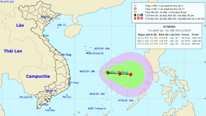 Dự báo đến 1 giờ ngày 6/11, áp thấp nhiệt đới dịch chuyển chậm theo hướng Đông, mỗi giờ đi được khoảng 5km và có khả năng mạnh lên thành bão, cơn bão số 6 năm 2019 trên Biển Đông. Vị trí tâm bão ở khoảng 13,4 độ Vĩ Bắc; 116,2 độ Kinh Đông, cách đảo Song Tử Tây (Quần đảo Trường Sa) khoảng 310km về phía Bắc Đông Bắc. Sức gió mạnh nhất vùng gần tâm bão số 6 mạnh cấp 8 (62-75km/giờ), giật cấp 9. Vùng nguy hiểm trên Biển Đông (gió mạnh cấp 6, giật cấp 8 trở lên): phía Bắc vĩ tuyến 11,5 độ Vĩ Bắc.