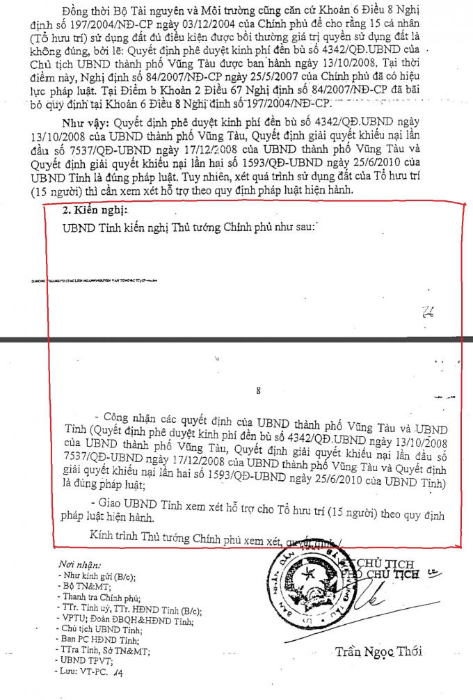 Thực hiện chỉ đạo của Thủ tướng Chính phủ, ngày 10/5/2011, UBND tỉnh Bà Rịa- Vũng Tàu đã có báo cáo số 2247/UBND- VP về việc ý kiến quan điểm giải quyết vụ việc của Bộ TN-MT tại văn bản 250/BTNMT – TTr. Theo đó, với lý do hồ sơ chứng nhận việc sử dụng đất của Tổ hưu trí là không rõ ràng thống nhất, UBND tỉnh đã giữ nguyên quan điểm giải quyết của địa phương là không công nhận đền bù về đất cho Tổ hưu trí.