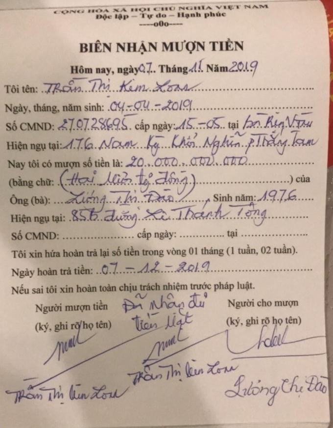 Hay trường hợp của bà Lâm Thu Trà cho Trần Thị Kim Loan vay 50 tỷ đồng (có giấy vay tiền) năm 2019, với cam kết sau một tháng sẽ trả lại. Đáng chú ý, giấy vay tiền có chữ ký của chồng là ông Giang Vinh, và vợ là Trần Thị Kim Loan.
