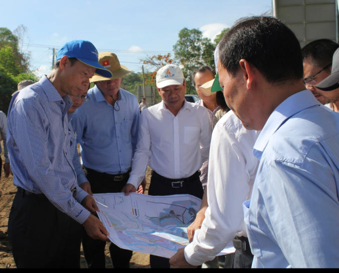 Ông Nguyễn Văn Thọ - Phó Bí thư Tỉnh ủy, Chủ tịch UBND tỉnh thị sát khu vực được đề xuất bố trí xây dựng tạm lán trại phục vụ thi công dự án Tổ hợp Hóa dầu miền Nam tại xã Long Sơn.