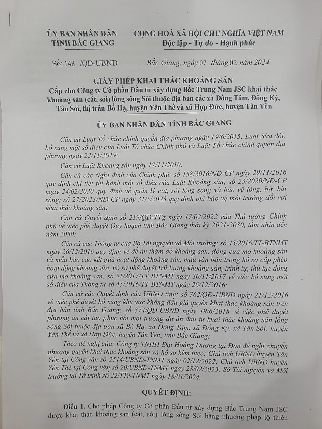Tìm hiểu của phóng viên Báo Pháp luật Việt Nam được biết, ngày 7/2/2024, ông Lê Ô Pích, Phó Chủ tịch UBND tỉnh Bắc Giang đã ký Giấy phép khai thác khoảng sản số 148/QĐ-UBND về việc cấp cho Công ty Cổ phần đầu tư xây dựng Bắc Trung Nam JSC khai thác khoáng sản (cát, sỏi) lòng sông Sỏi thuộc địa bàn các xã Đồng Tâm, Đồng Kỳ, Tân Sỏi, thị trấn Bố Hạ, huyện Yên Thế và xã Hợp Đức huyện Tân Yên.