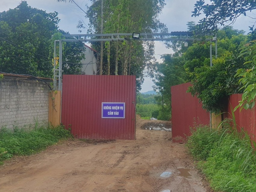 | Lối ra vào điểm mỏ của Công ty Bắc Trung Nam JSC không có biển báo theo giấy phép mà chỉ đề tấm biển không nhiệm vụ miễn vào. |