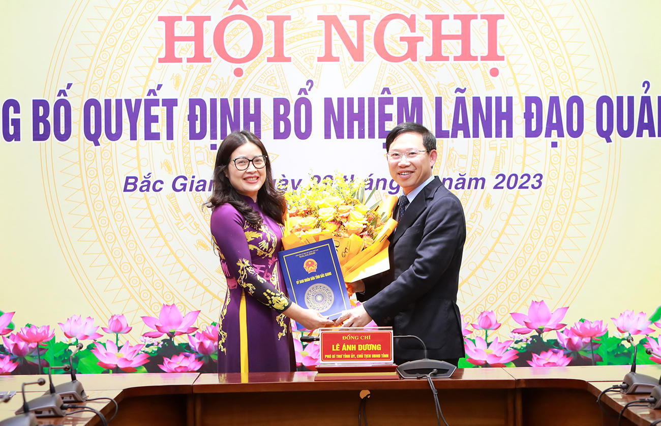 Chủ tịch UBND tỉnh Lê Ánh Dương trao Quyết định và tặng hoa chúc mừng bà Nguyễn Thị Thu Hương. Ảnh; Dương Thuỷ