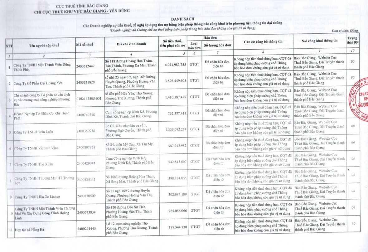 Văn bản nêu rõ, căn cứ vào hồ sơ, sổ sách cơ quan thuế đang theo dõi tình hình thu, nộp thuế của các doanh nghiệp do Chi cục thuế khu vực Bắc Giang - Yên Dũng quản lý, tính đến thời điểm 27/3/2024 một số tổ chức, cá nhân trên địa bàn có số thuế nợ đọng thời gian kéo dài. Chi cục thuế khu vực Bắc Giang - Yên Dũng đã thường xuyên đôn đốc bằng điện thoại; phát hành thông báo và tính chậm nộp tiền thuế; cưỡng chế nợ thuế nhưng doanh nghiệp vẫn chưa nộp tiền thuế, tiền phạt, tiền chậm nộp vào ngân sách Nhà nước.