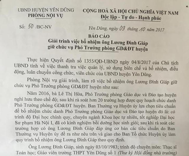 Câu chuyện thầy giáo Lương Đình Giáp từ một giáo viên đã vượt qua đến hơn 20 cá nhân vốn đã được quy hoạch cho chức danh Phó phòng giáo dục đã được Phòng Nội vụ UBND huyện Yên Dũng làm rõ Văn bản số 50/BC-NV do trưởng phòng Tô Văn Lượng ký.