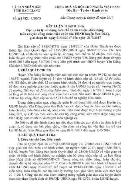 Từ báo cáo của đoàn thanh tra, ngày 2/10/2017, Chủ tịch UBND tỉnh Bắc Giang Nguyễn Văn Linh ký Kết luận thanh tra số 1663/KL-UBND về việc quản lý, sử dụng biên chế và bổ nhiệm, điều động, luân chuyển công chức, viên chức của UBND huyện Yên Dũng giai đoạn từ ngày 1/1/2017 đến ngày 31/7/2017.