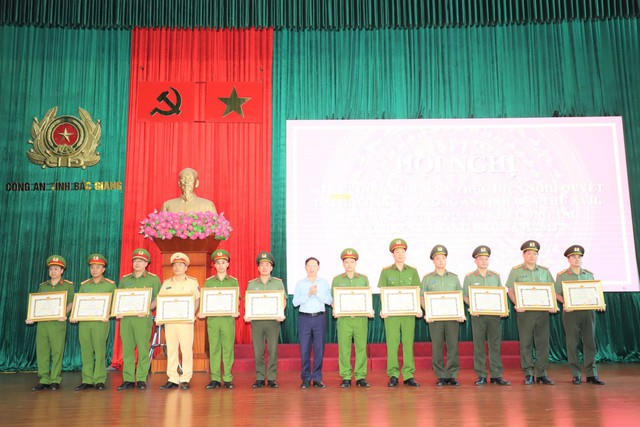 Lãnh đạo tỉnh Bắc Giang tặng bằng khen cho các tập thể, cá nhân Công an tỉnh Bắc Giang nhân dịp sơ kết giữa nhiệm kỳ thực hiện Nghị quyết Đại hội Đảng bộ Công an tỉnh Bắc Giang nhiệm kỳ 2020-2025. (Ảnh: Công an tỉnh Bắc Giang)