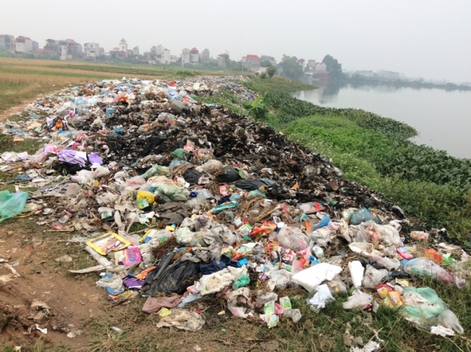 | Bãi rác tập trung của thôn Khả Lý Hạ, xã Quảng Minh, huyện Việt Yên (Bắc Giang) tràn lan ra lòng đường và một góc hồ Cầu Tam Quang. |