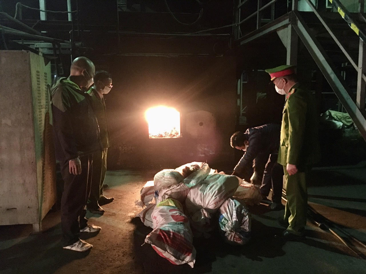 Tiêu hủy toàn bộ số thịt lợn đông lạnh nhiễm virut. Ảnh: Công an tỉnh Bắc Giang