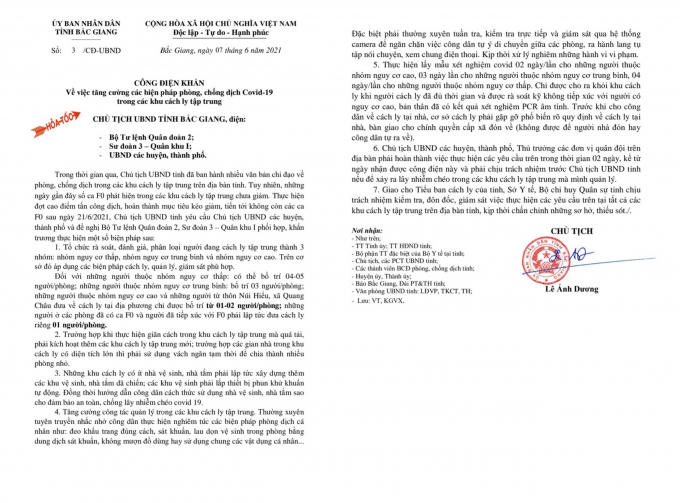 Công điện khẩn số 3/CĐ/UBND của Ủy ban Nhân dân tỉnh Bắc Giang.
