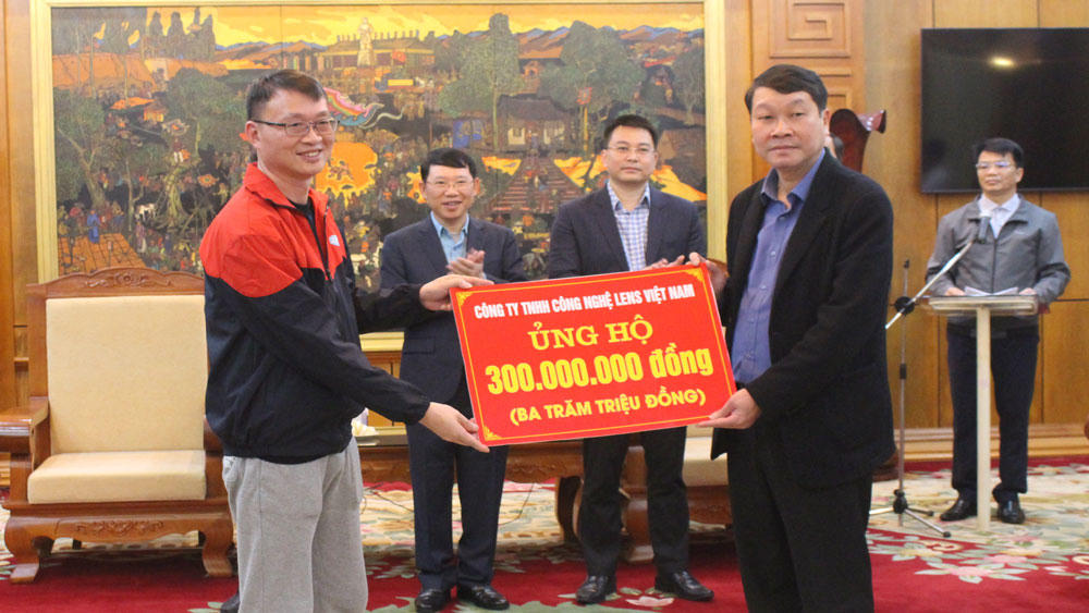 Đại diện chính quyền huyện Sơn Động tiếp nhận kinh phí ủng hộ của Công ty TNHH Công nghệ LENS Việt Nam. (Ảnh: báo Bắc Giang)