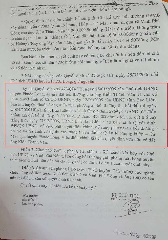 Theo hồ sơ thể hiện, ngày 25/01/2006, Chủ tịch UBND tỉnh Bạc Liêu có Quyết định số 121/QĐ-UBND về việc phê duyệt phương án bồi thường, hỗ trợ và tái định cư thuộc dự án xây dựng tuyến đường Quản lộ Phụng Hiệp (đoạn đi qua xã Vĩnh Phú Đông, huyện Phước Long).