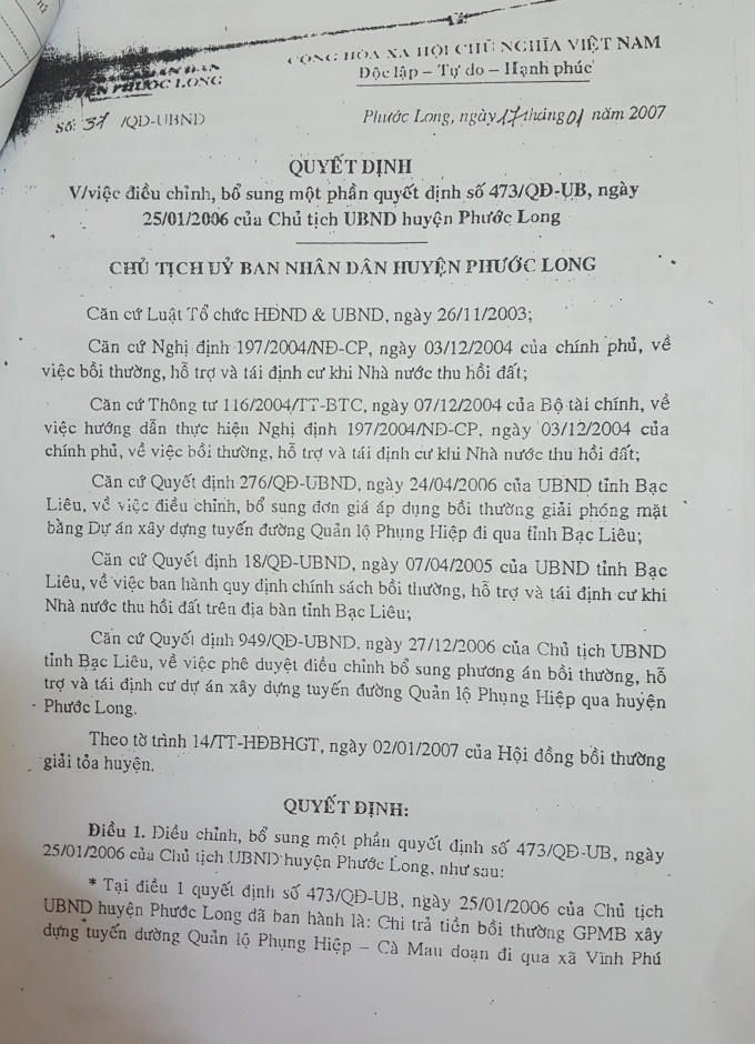 “Sau khi huyện Phước Long triển khai phương án bồi thường thu hồi đất thì ngày 24/4/2006 UBND tỉnh Bạc Liêu ban hành Quyết định 276/QĐ-UBND, đã điều chỉnh giá đất bồi thường từ 80.000đ/m2 thành 425.000đ/m2 (đối với đất thổ cư)”, Quyết định số 37/QĐ-UBND ngày 17/01/2007 của UBND huyện Phước Long (về việc điều chỉnh, bổ sung một phần Quyết định số 473/QĐ-UB ngày 25/01/2006 của Chủ tịch UBND huyện Phước Long) có nêu.