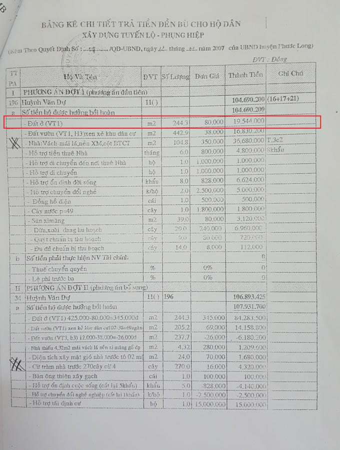 Cụ thể, tại Phiếu chi trả tiền đền bù của Ban Đền bù giải phóng mặt bằng huyện Phước Long (kèm theo Quyết định số 496/QĐ-UB, ngày 25/01/2006 của UBND huyện Phước Long) cho hộ ông Huỳnh Văn Dự (ấp Vĩnh Phú A, xã Vĩnh Phú Đông) thể hiện, ông Dự có 244,3m2 đất ở thuộc vị trí 1 nhưng được đền bù chỉ 80.000đ/m2. Các hộ Đỗ Thị Tư, Lý Văn Thạnh, Nguyễn Thị Nhanh, Nguyễn Văn Việt cho biết cũng rơi vào hoàn cảnh tương tự.